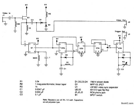 This circuit will extract vertical sync from a video signal, produce a vertical sync pulse, and add an adjustable delay. This permits a delayed sweep effect to enable a scope to look at any particular horizontal line. It is useful for older scopes. (View)