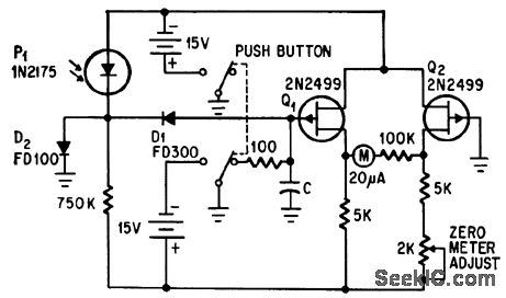 Measures and holds intensity of single flash or total value of series of flashes.-C. R. Kerns, FET Circuit Stores Light Measurement, Electronics, 38:22, p 66.