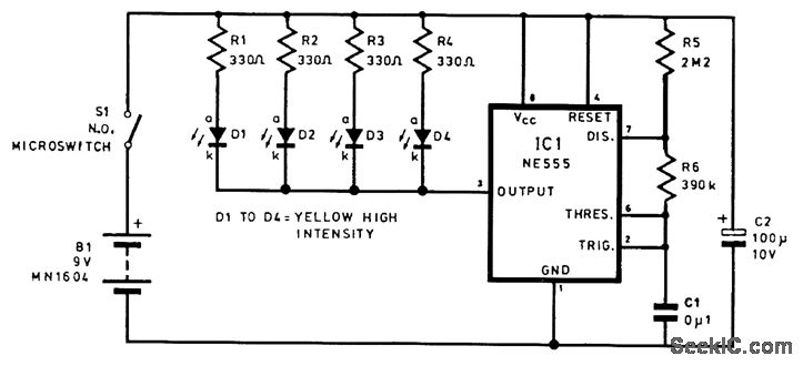 This circuit was used to simulate machine gun firing on a model aircraft, but it can also be used for other applications.
