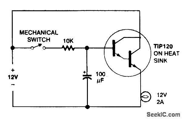 The lamp turns on and off gradually, controlled by the charging and discharging of the capacitor. Here is a circuit that will do the job. It uses a TIP120 power transistor as a voltage-regulating element. The voltage across the lamp is always 1.2V lower than the voltage across the capacitor. Closing the switch charges the capacitor gradually over a period of a few seconds, causing the voltage to go up. When the switch opens, the capacitor slowly discharges and the voltage goes down again. You might have to experiment with component values to get the effect you want. The capacitor controls both the rise time and the fall time; the resistor controls the rise time only. In both cases, larger values make the action go more slowly. Be sure to mount the TIP120 transistor on a heatsink, and remember that its mounting hole is connected to the collector (and thus to +12 V in the circuit).