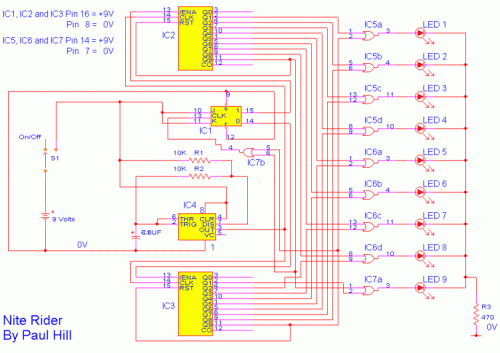 As a keen cyclist I am always looking for ways to be seen at night. I wanted something that was a novelty and would catch the motorists eye. So looking around at my fellow cyclists rear lights, I came up with the idea of 'NITE-RIDER'. NINE extra bright LED's running from left to right and right to left continuously. It could be constructed with red LEDs for use on the rear of the bike or white LED's for an extra eye catcher on the front of the bike.All IC's are CMOS devices so that a 9V PP3 battery can be used, and the current drawn is very low so that it will last as long as possible.