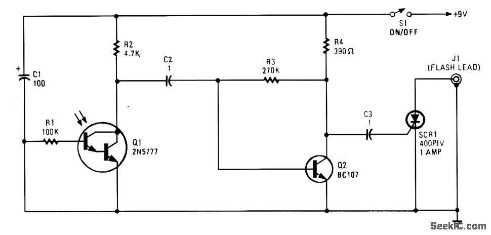 Phototransistor Q1 receives a light pulse from a photoflash unit. The pulse is accoupled to am-plifier Q2. It then triggers SCR1, which triggers a flash unit that is connected to J1.
