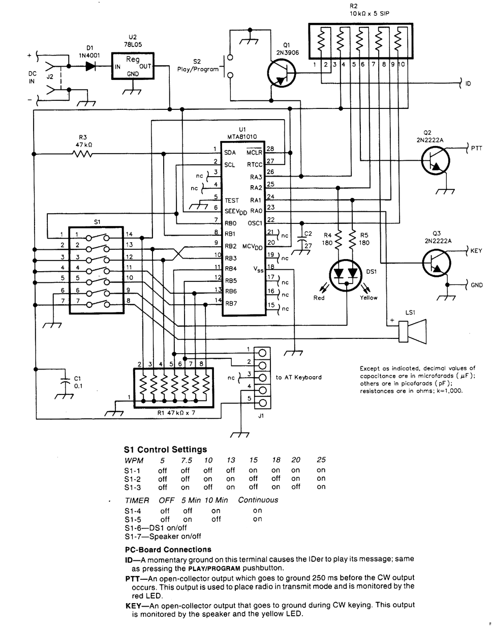 The identifier uses an MTA81010 microchip,containing a 1024-bit serial EEPROM and a rmcro-controlier It runs from a 9-V battery.A standard AT-type keyboard is used to progran the desiredmessage Speed varles from 5 to 25 wpm.
