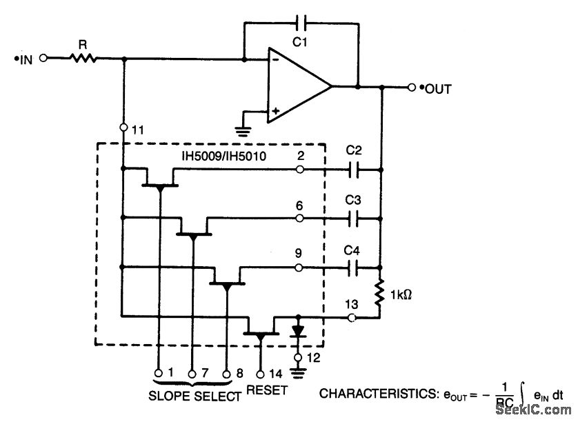 By using analog swi,ch IH5009/IH5010 to select various capattors, a variable slope integrator can be had.If C3=2(C2) and C4=4(C2), seven different slopes can be obtained if binary informatlon is fed to pins 1, 7, and 8 of the analog switch.