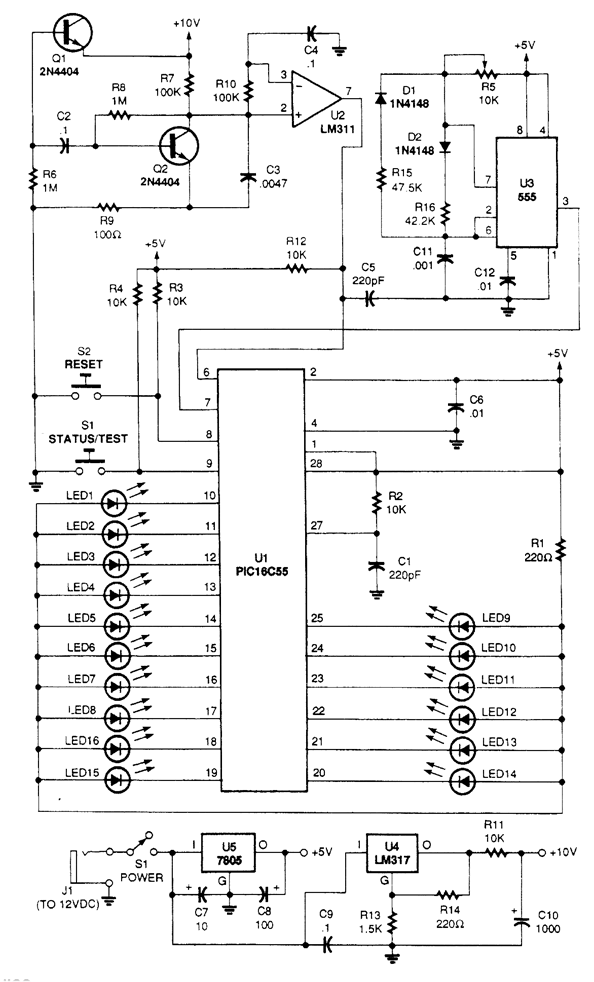 This circuit generates a random output that is translated into LED movement by a prepro-grammed PIC16C55 microcontroller, U1. That PIC also senses and records the bias of the LED's movement. This device was originally used for an application involving psychokinesis testing where the person was asked to think the lights in either a clockwise or counterclockwise direction.