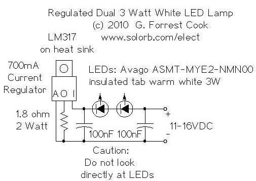 This project involves constructing an energy efficient dual 3 Watt white LED array that runs on 12VDC at 700mA. The lamp is useful for indoor indirect room lighting. The light that is produced does not flicker and has a regulated brightness from 11V to the maximum operating voltage. The Avago 3W white LEDs are rated at 3 watts (nominal). Never stare directly at this lamp when it is running at full operating power, it is dangerously bright.