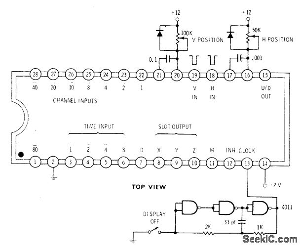 National 5841 IC is used for display of video game scores on TV receiver, as well as for time and channel number displays.Properly conditioned H and V pulses must be applied to pins 18 and 19 to interface TV. Output video on pin 15 must be buffered and summed into existing video inside TV set. Display position is controlled by H and V pots. Horizontal display size depends on clock frequency.Grounding M input gives only channel number.Positive voltage at M gives both channel and time. Grounding D input provides 5-slot time display, while positive D input gives 8-slot time display. Channel inputs are applied continuously in negative-logic form, with time inputs multiplexed externally.-D. Lancaster, CMOS Cookbook, Howard W. Sams, Indianapolis, IN, 1977, p 158.