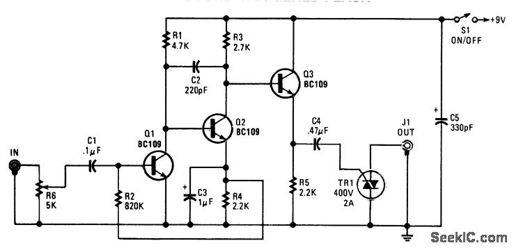 Audio input from a microphone drives amplifier Q1/Q2/Q3 to produce an ac voltage across R5. C4 couples this to TRI, causing it to conduct, triggering photoflash or other device that is connected to J1.