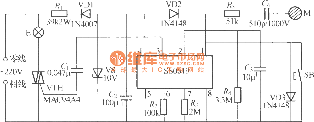 The touching stepping dimmer shown as the chart is composed of SS0619 IC, and it has touching and keying modes, which can make the brightness of E change optionally at the cycle of low, medium, bright, turning off .