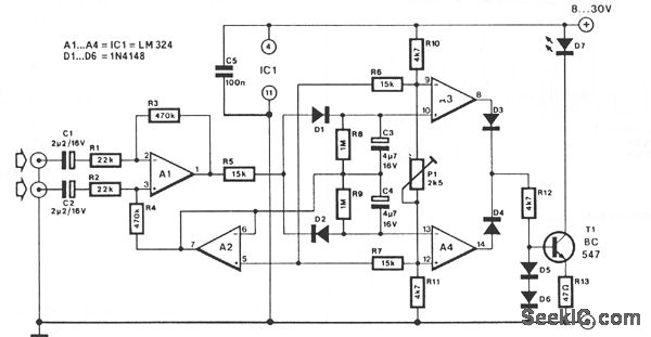 On most FM tuners, the stereo indicator lights upon detection of the 19-kHz pilot tone. However, this doesn't mean that the program is actually stereophonic, since the pilot tone is often transmitted with mono programs also. A similar situation exists on stereo amplifiers, where the stereo LED is simply con-trolled from the mono/stereo switch.The LED-based stereo indicator described here lights only when a true stereo signal is fed to the inputs. Differential amplifier A1 raises the difference between the L and R input signals. When these are equal, the output of A1 remains at the same potential as the output of A2, which forms a virtual ground rail at half the supply voltage. When A1 detects a difference between the L and R input signals, it supplies a positive or negative voltage with respect to the virtual ground rail, and so causes C3 to be charged via D1 or C4 via D2. Comparator A3/A4 switches on the LED driver via OR circuit D3/D4. The input signal level should not be less than 100 mV to compensate for the drop across Dl or D2. The sensitivity of the stereo indicator is adjustable with P1.