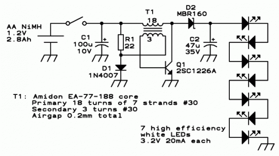 The single cell led flashlight circuit is a self-oscillating boost converter. A typical white LED has its best power-efficiency combination at about 20mA, and needs about 3.3V. This makes for a power of about 66mW per LED. In this circuit are 7 series LEDs so we need a driver circuit that will provide about 23V at 20mA, when fed from a 1.2V NiMH rechargeable cell or from a 1.5V alkaline cell.