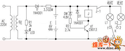 When the battery's output voltage is normal, the dw is punctured, vt is connected and also the relay is connected. The high beam or low beam light can be controlled by k to work. When the battery voltage is lower than 5.4V, the dw is disconnected to make the vt disconnected and the j open. The high beam or low beam light can not work continuously, so e stop discharging. This could protect the battery efficiently.