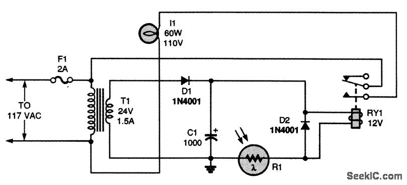 When the phone rings, the flasher turns on and off, causing photocell R1 to conduct. Relay RY1 is then energized, which completes the circuit between the light and the ac line. Thus, the light flashes in step with the rings.