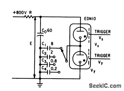 Two discharge tubes provide shared cycle of operation, to boost stroboscope firing rate to 1,000 flashes per second. tamp circuit, with range-switched discharge capacitors, receives triggers in alternation.-L. H. Barrett, New Circuit Improves Stroboscope Versatility, Electronics, 32:32, p 116-118.