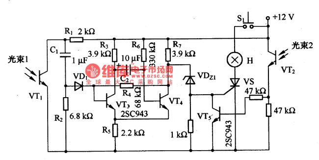 This is a burglar-alarm system circuit of LED. To enlarge the alarm range, the circuit is installed with two LED as the light receiver. The light resource is a infrared ray LED, to reduce the interruption from other rays, it needs to modulate the LED ray. If the beam of the LED is shadowed, the NPN of VTI stops work, and CI generates electricity through VD1, and the base electrode of VT3 is provided with current and VT3 is passable. In the meantime, the single stable circuit consisting of VT3 and VT4 is in a temporarily stable state.