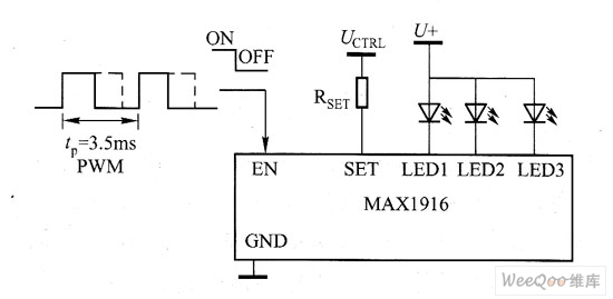In the figured MAX1916 application circuit, a single external resistor (RSET) can be used to set the current value of each LED, and the simple brightness control (dimming function) can be fulfilled by adding wide modulation signals on the pin (EN) of the IC. By using the method of setting the LED current with the resistor RSET, little PCB space is occupied, in this method, in addition to MAX1916(6 little 6-pin SOT23 packages) and several external capacitors, only an external resistor is needed.