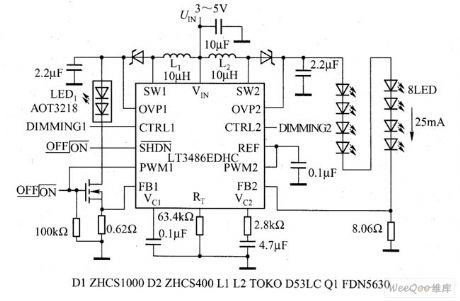The dual-channel booster LT3486 produced by Linear Technology can drive 16 white light LEDs with a constant current(each channel has 8 serial LEDs), it can not only provide with PWM dimming, but also maintain the light color of the LED. It is fitted in portable electric equipment, car screens and other situations. LT3486 dims by controlling the working period of PWM, and the dimming range is 1000:1. It keeps the even LED brightness by the current mode and solid frequency.