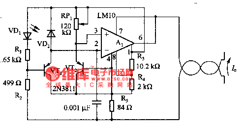 The figure is a transmission circuit of shifting D/A with LED. The circuit is to do log transmission to VD2 photo-current in the tested area, and the current is delivered to distant equipment in terms of dual-line currents. RP1 is used to set the intermediate range which is to be tested, and the temperature nature of the transformation coefficient is compensated by R5.
