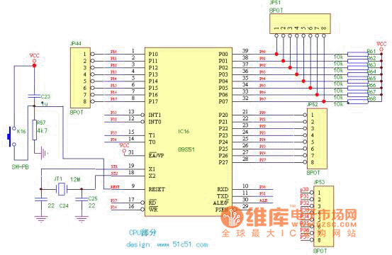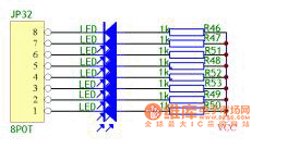 Experiment 1 the simplest eight rolling subtitles. Conect the P1 port of CPU(JP44) with JP32 part of the Eight light by a data cable 8PIN; You will see 8 lights flashingalternately.