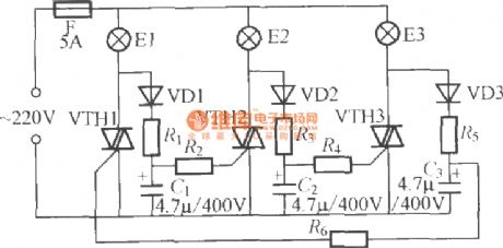 As shown in figure, it uses three-way flashing light string controller with three ordinary TRIACs, and it can make light string be lit in a cycle, the maximum output power of each road is up to 1000W, and the circuit is simple and easy to produce. VTH1 ~ VTH3 use 5A, 600V TRIAC, the maximum load power is up to 1000W ; VD1~VD3 can use 1N4007 ordinary silicon rectifier diodes.