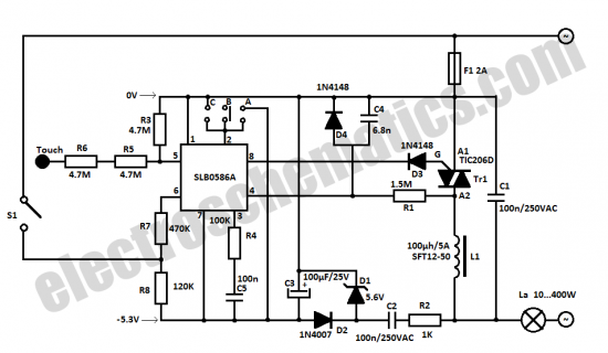 With IC SLB0586A from Siemens you can build a simple touch light dimmer circuit that will allow you to adjust the lamp intensity. Together with a TIC206D triac, it enables smooth regulation of light intensity from a bulb of 10W ā 400W. A coil of 100µH/5A is required to suppress switching noise.