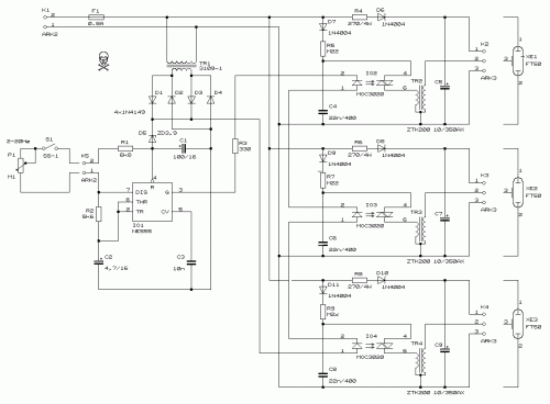 PartsR1 = 6,8 kR2 = 5,6 kR3 = 330R4,R6,R8 = 270 / 5 WR5,R7,R9 = 220 kP1 = 100 k linear potentiometerC1 = 100 uF / 16 VC2 = 4,7 uF / 16 VC3 = 10 nFC4,C6,C8 = 22 nF / 400 V, MKSC5,C7,C9 = 10 uF / 350 V, electrolytic (high quality)TR1 = Ordinary transformer 230 V / 9 V, 1,5 VATR2,TR3,TR4 = stroboscope transformer np (ZTK200)D1,D2,D3,D4 = 1N4149D5 = BZX85V Zener 3.9D6,D7,D8,D9,D10,D11 = 1N4004IO1 = NE555IO2,IO3,IO4 = MOC3020XE1,XE2,XE3 = stroboscope lamps FT50F1 = Fuse 0.8 A, 20 mmK1,K5 = connectors ARK200-2K2,K3,K4 = connectors ARK200-3S1 = Switch