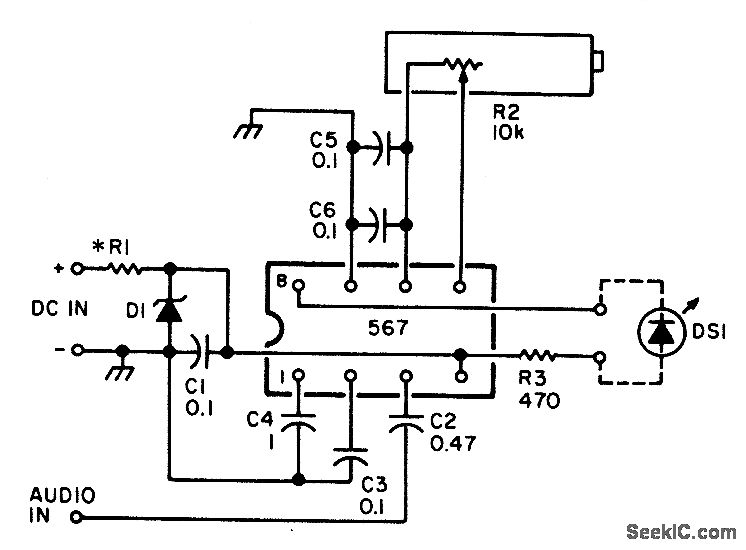 An NE567 tone decoder, tuned to the transceiver's CW offset frequency, ensures that the transceiver will be transmitting on the same frequency as the received CW signal. Simply tune the transceiver so that the LED lights. Eight to 13 Vdc is required; this can be taken from the transceiver supply or an extra battery. Audio is taken from the speaker or headphone output.