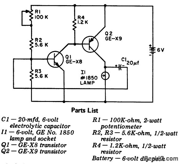 Warning flasher light. This device is handy to have around boats, cars, and camp sites. The circuit is a two-stage direct-coupled transistor amplifier connected as a free-running multivibrator. Both flash duration and flash interval can be adjusted by R1 (courtesy General Electric Company).