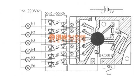 The circuit uses 5-way flash signal output by HFC3018 to drive solid state relays SSR1 ~ SSR5 and make them sequentially turn on and off, which enables the lantern strings E1 ~ E5 to be extinguished in a turn. Manifold output analog sound signal can drive solid state relay SSR6, which make the the six groups of lantern chain E6 flash with analog sound storaged in manifold, pressing the button switch SB one time can obtain a flashing mode. HFC3018 has eight kinds of analog sound, it can produce eight different flashing effects.