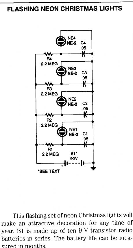 This circuit is intended as a reliable replacement to thermally-activated switches used for Christmas tree lamp-flashing. The device formed by Q1, Q2 and related resistors triggers the SCR. Timing is provided by R1,R2 & C1. To change flashing frequency don't modify R1 and R2 values: set C1 value from 100 to 2200µF instead.Best performances are obtained with C1=470 or 1000µF and R4=12K or 10K. Due to low consumption of normal 10 or 20 lamp series-loops intended for Christmas trees (60mA @ 220V typical for a 20 lamp series-loop), very small and cheap SCR devices can be used, e.g. C106D1 (400V 3.2A) or TICP106D (400V 2A), this last and the suggested P0102D devices having TO92 case. (View)
