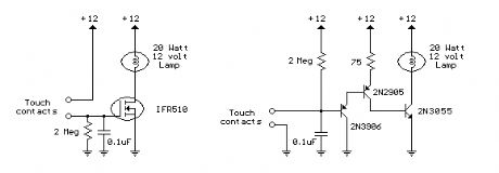 The circuit on the right uses three bipolar transistors to accomplish the same result with the touch contact referenced to the negative or ground end of the supply. Since the base of a bipolar transistor draws current and the current gain is usually less than 200, three transistors are needed to raise the microamp current level through the touch contacts to a couple amps needed by the light. For additional current, the lamp could be replaced with a 12 volt relay and diode across the coil. (View)