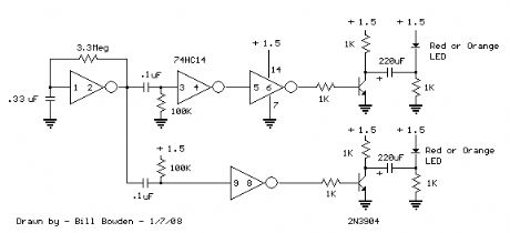 This 1.5 volt led fasher runs more than a year on a single 'd cell and alternately flashes 2 LEDs at about a 1 second rate. The circuit employs a 74HC14 CMOS hex inverter that will operate at very low voltages (less than 1 volt). One section is used as a squarewave oscillator (pins 1 and 2), while the others are wired to produce a short 10mS pulse on alternate edges of the square wave so the LEDs will alternate back and forth. The output sections each use a capacitor charge pump to increase the voltage for the LEDs. The circuit draws an average current of 800uA from the 'D' battery and the LED peak current is about 40mA with a fresh battery and drops to about 10mA as the battery voltage falls to 1.1 volts. The capacity of a alkaline 'D' cell is about 12 amp hours with a cutoff voltage of 1.1 so the circuit should run about 12/.0008 = 15000 hours or maybe 625 days, but I haven't verified that yet. (View)