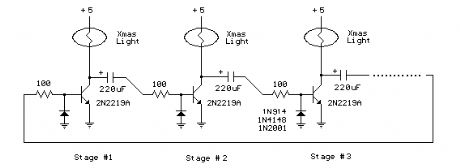 The drawing below illustrates a multistage light sequencer using descrete parts and no integrated circuits. The idea is not new and I hear a similar circuit was developed about 40 years ago using germanium transistors. The idea is to connect the lights so that as one turns off it causes the next to turn on, and so forth. This is accomplished with a large capacitor between each stage that charges when a stage turns off and supplies base current to the next transistor, thus turning it on. Any number of stages can be used and the drawing below illustrates 3 small Christmas lights running at about 5 volts and 200mA. The circuit may need to be manually started when power is applied. To start it, connect a momentary short across any one of the capacitors and then remove the short. You could use a manual push button to do this.