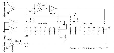The circuit below uses a hex Schmitt Trigger inverter (74HC14) and two 8 bit Serial-In/Parallel-Out shift registers (74HCT164 or 74HC164) to sequence 16 LEDs. The circuit can be expanded to greater lengths by cascading additional shift registers and connecting the 8th output (pin 13) to the data input (pin 1) of the succeeding stage. A Schmitt trigger oscillator (74HC14 pin 1 and 2) produces the clock signal for the shift registers, the rate being approximately 1/RC. Two additional Schmitt Trigger stages are used to reset and load the registers when power is turned on. Timing is not critical, however the output at pin 8 of the Schmitt Trigger must remain high during the first LOW to HIGH clock transition at pin 8 of the registers, and must return low before the second rising edge to load a single bit. If the clock rate is increased, the length of the signal at pin 9 of the Schmitt Trigger should be reduced proportionally to avoid loading more than one bit. The HCT devices will normally provide about 4 mA (source or sink) from each output but can supply greater currents (possibly 25 mA) if only one output is loaded. The common 150 ohm resistor restricts the current below 25 mA using a 6 volt power source. If the circuit is operated with two or more LEDs on at the same time, resistors may be needed in series with each LED to avoid exceeding the maximum total output current for each IC of 25 mA. For greater brightness, individual buffer transistors can be used as shown in the 10 stage LED sequencer on this same page. (View)
