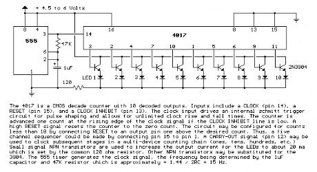 Note that the 4017 counter will not deliver much current, and so the LED current is set to about 6mA using a 1.5K resistor in series. For more current, you could use transistors on each output as shown in the drawing above, (10 Channel LED Sequencer). But some of the newer bright LEDs are fairly bright at 6mA. (View)