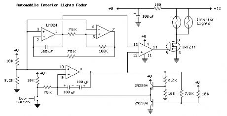 The top two opamps (pins 1,2,3 and 5,6,7) form a triangle wave oscillator running at about 700Hz while the lower opamp (pins 8,9,10) produces a linear, 5 second ramp, that moves up or down depending on the position of the door switch. The two transistors and associated resistors serve to limit the ramp voltage to slightly more and less than the upper and lower limits of the triangle waveform. These two signals (700 hZ. triangle wave and 5 second ramp) are applied to the inputs of the 4th opamp (pins 12,13,14) that serves as a voltage comparator and generates a varying duty cycle square wave that controls the IRFZ44 MOSFET and lamp brightness. The 5 second fade time can be adjusted with the 75K resistor connected to the door switch. A larger value will increase the time and a smaller value will speed it up.