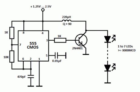 This simple LED driver circuit allows us to drive up to seven LEDs by using a single NiMH (Nickel Metal Hydride) AA cell. The circuit produces voltage pulses at a much higher level than the input supply voltage by pulsing the 220 uH inductor. The inductor must be a high Q (Q>90) power inductor. When the input is 1.25 V and the LEDs are connected, the voltage pulse level will be 23V.The LED driver uses a CMOS 555 timer since it operated with low voltages and can work for about 190 hours when using a single NiMH battery cell rated at 2000 mAh. The 555 timer drives the transistor at 222 kHz rate.