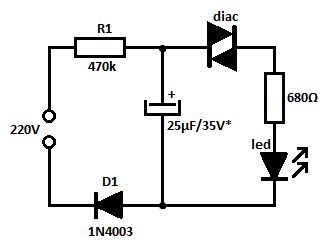 This is a simple blinking led circuit powered from 220V that can be used to mark special places or as voltage indicator. The voltage from the mains charges the capacitor through R1 resistor and D1 diode.As long as the capacitor’s voltage doesn’t exceeds the diac’s switching voltage the cap is acting as a blocked diode. After reaching the switching voltage the diac is conducting and the cap’s discharging current lights up the LED.