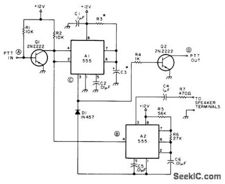 Prevents unnecessary repeater timeouts by generating warning tone in loudspeaker of mobile transceiver when transmitter is on too long. Normal push-to-talk line is broken and connected to points A and D. Pushing talk button starts timer. Time in seconds is 1.1 R3C3, with R3 in megohms and 03 in microfarads. Thus, 1 megohm and 27μF give 30 s, while 2 megohms and 81μF give 180 s.-J. A. Kvochick, Keeping the Wind Down, 73 Magazine, Feb. 1977, p 50. (View)