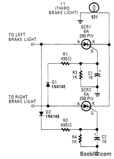 The circuit is designed to light (via SCR1 and SCR2) only when both the left and right brake lights are activated. The circuit operates on 12-V negative-ground systems. When the brake pedal is depressed, 12 V is applied to the left and right brake lights. The gates of the two SCRs are trig-gered and current flows through the SCRs, which turns on the third brake light. (View)