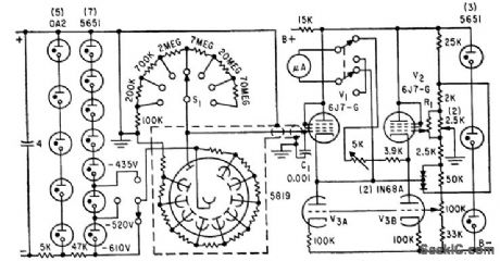 Illuminated photocell triggers mvbr chain. Starter-mvbr is triggered by positive pulse on grid of V1A, but remaining mvbr stages are triggered by negative pulse on cathode. Output pulses are taken from across 6,800-ohm resistor and a-c coupled to gate.-E. L. Thomas, R. Howat, and N. H. Mackworth, Tv Tracker Records Eye Focus Points, Electronics, 33:17, p 57-59. (View)