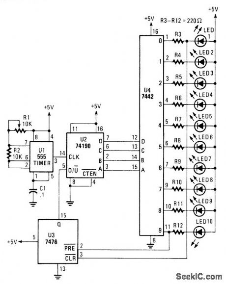 A 555 timer clocks a 74190 up/down counter. The 74190 drives BCD decoder driver 7442. The 7476 is used to reverse the count on 0 and 9, which results in an up-down-up-down count sequence. (View)