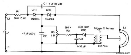 This circuit uses a voltage doubler CR1 and CR2 to obtain about 280 V dc across C1. C2 and R3 form a voltage divider to obtain a dc voltage to change C3 thru R2. When CR3 fires, a high voltage is generated in T1, firing L1.