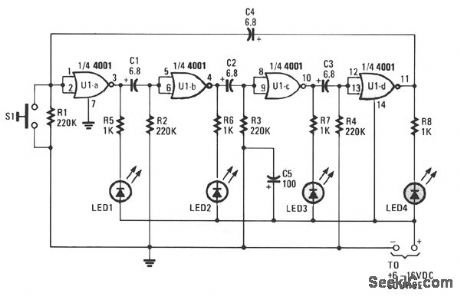 When power is first turned on, two of the LEDs are on and the other two remain off until the timing cycle reverses. The LEDs flash in pairs, but by pressing and holding S1 closed until only one of the LEDs is on, and then releasing it, the four LEDs can be made to flash in sequential order. The number of LEDs flashing in a sequential ring can be easily increased to eight by adding another 4001 quad NOR gate. Just repeat the circuit and connect the additional circuit in series with the first-input to output-as an extension of the first circuit. When power is connected to the eight-LED flasher circuit, four LEDs will turn on at once and then flash off as the four remaining LEDs come on. As before, just press S1 and hold closed until all but one LED turns off; then the LEDs will begin their sequential march in a circle. You can connect as many circuits in series as you like. (View)
