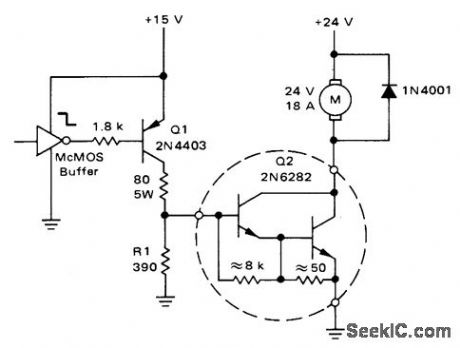 Low-level output of CMOS buffer turns on DC motor through Q1 and 20-A Darlington power transistor Q2.-A. Pshaenich,” Interface Techniques Between Industrial Logic and Power Devices,” Motorola, Phoenix, AZ, 1975, AN-712A, p 18. (View)