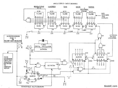 DigitaI display circuit tracks stepper-motor shaft movements. Up/down decade counters read out four BCD digits as travel angle (000.0 to 360.0) in degrees and number of completed revolutions (0 to 9). Stepper under study is driven by state generator that produces high-current square-wave pulses under control of clock used for display, which can be external square-wave generator or clock output of microprocessor such as KIM-1:. Power source for digital display is 5 V at 1.2 A. Applications include monitoring movements of incremental plotters, precision film camera drives, numerical control machines, and precision start-stop motions of fuel control rods in nuclear reactor.-H. Lo, Digital Display of Stepper Motor Rotation, Computer Design, April1978, p 147-148 and 150-151.
