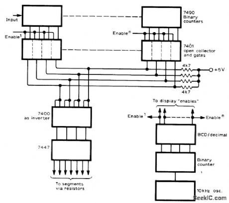 Three or more displays can be multiplexed simply by gating 7490 counter output via 7401, then using OR connection for outputs. 7401s are switched on in rotation by positive enable signal which also switches displays on in turn. If using common-cathode displays, segment and display enable signals must be inverted. With individual display units, segments must be paralleled.-G. A. Bobker, Simplified Multiplexing, Wireless World, Feb. 1978, p 59. (View)