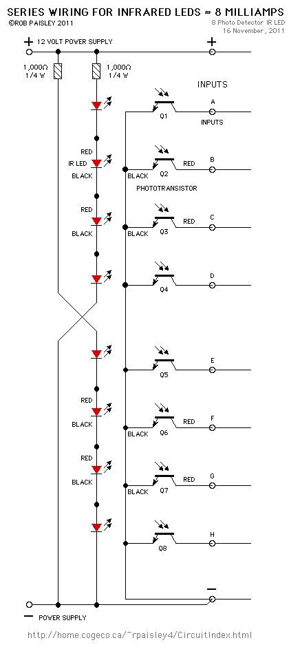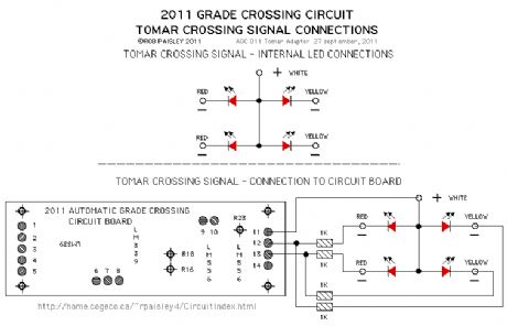 IF more than one set of flashers is used at a particular crossing the LED's could be wired in series so as to keep the number of output control circuits to a minimum. This is shown on the basic flasher schematic.