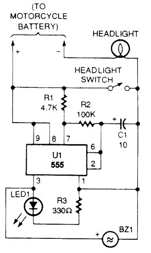 Increasing the value of R2 or C1 will lower the oscillator's frequency and decreasing one of those values will increase the frequency. The IC's output at pin 3 drives the LED through R3 and sends power to the piezo sounden Use a bright LED so that you will be able to see it in the daytime. (View)
