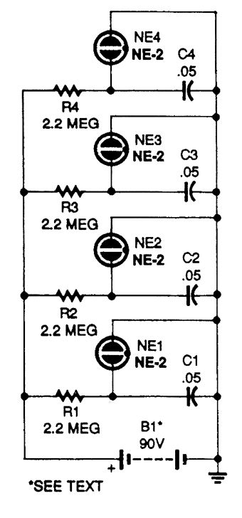 This flashing set of neon Christmas lights will make an attractive decoration for any time of year. B1 is made up of ten 9-V transistor radio batteries in series. The battery life can be measured in months. (View)
